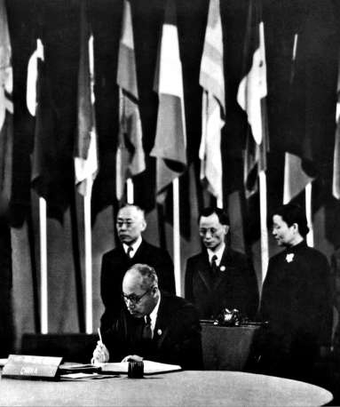 6月26日,《联合国宪章》举行签字仪式。按照英文顺序,中国代表团是“四强”中第一个签字的国家。