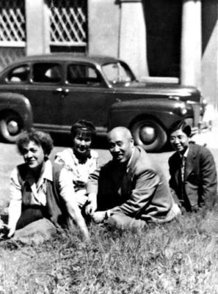 董必武(右二)与史沫特莱(左一)在草地上聊天。