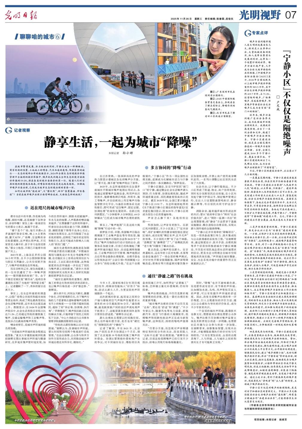 一个宜居的城市声环境,既靠技术也靠文化,需要政府治理也需要公众参与。噪声治理不仅依赖对噪声监管主体及其职责划分的进一步明确,也需要社区共建与公众参与的进一步加强。在谢辉看来,依靠集体智慧,实现共治共享,才能增强政策执行的针对性与可持续性。“只有在更加系统、全面的治理思维下,人与环境、人与城市之间的和谐共生才有可能真正实现。”