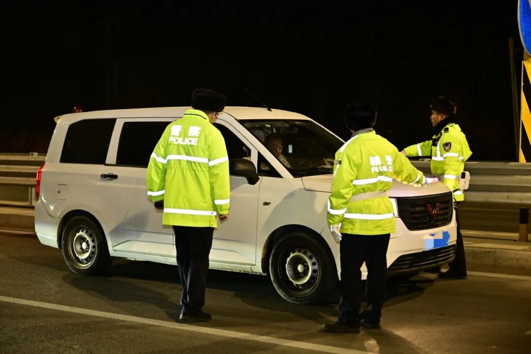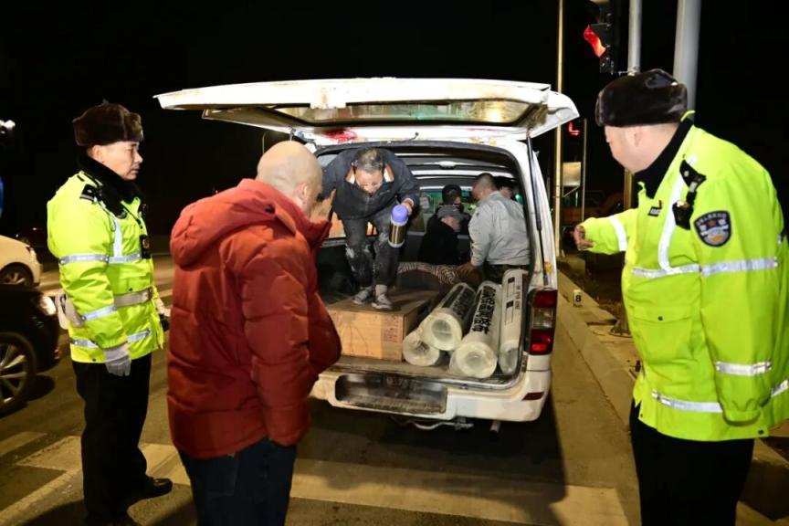车门拉开,车厢内略显拥挤。交警借着执法手电的光线,发现乘载7人,于是对司机说:“这辆车核载6人,你们超载了。请大家先下车,注意安全。”