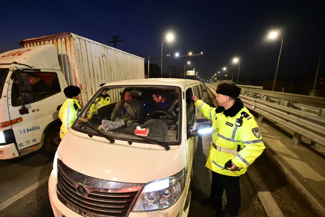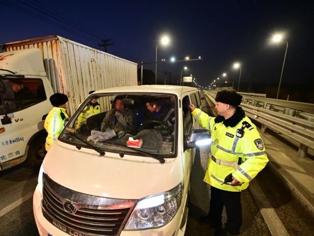 早上五点半,通州区九周路附近,一辆辆拉着务工人员的小型客车、面包车,在灯光照耀下陆续驶来。一辆白色金杯车在交警示意下靠边停下。交警上前轻轻敲了车窗:“师傅,请开一下车门,我们例行检查。”