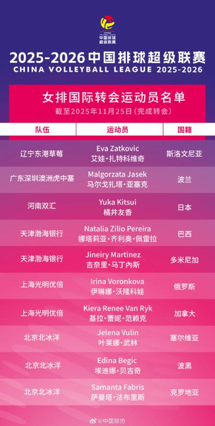根据《2025-2026中国排球超级联赛竞赛规程》,各成年队可同时上场最多两名外援。外援报名将于12月10日截止,参赛各队后续或将还有引援动作。