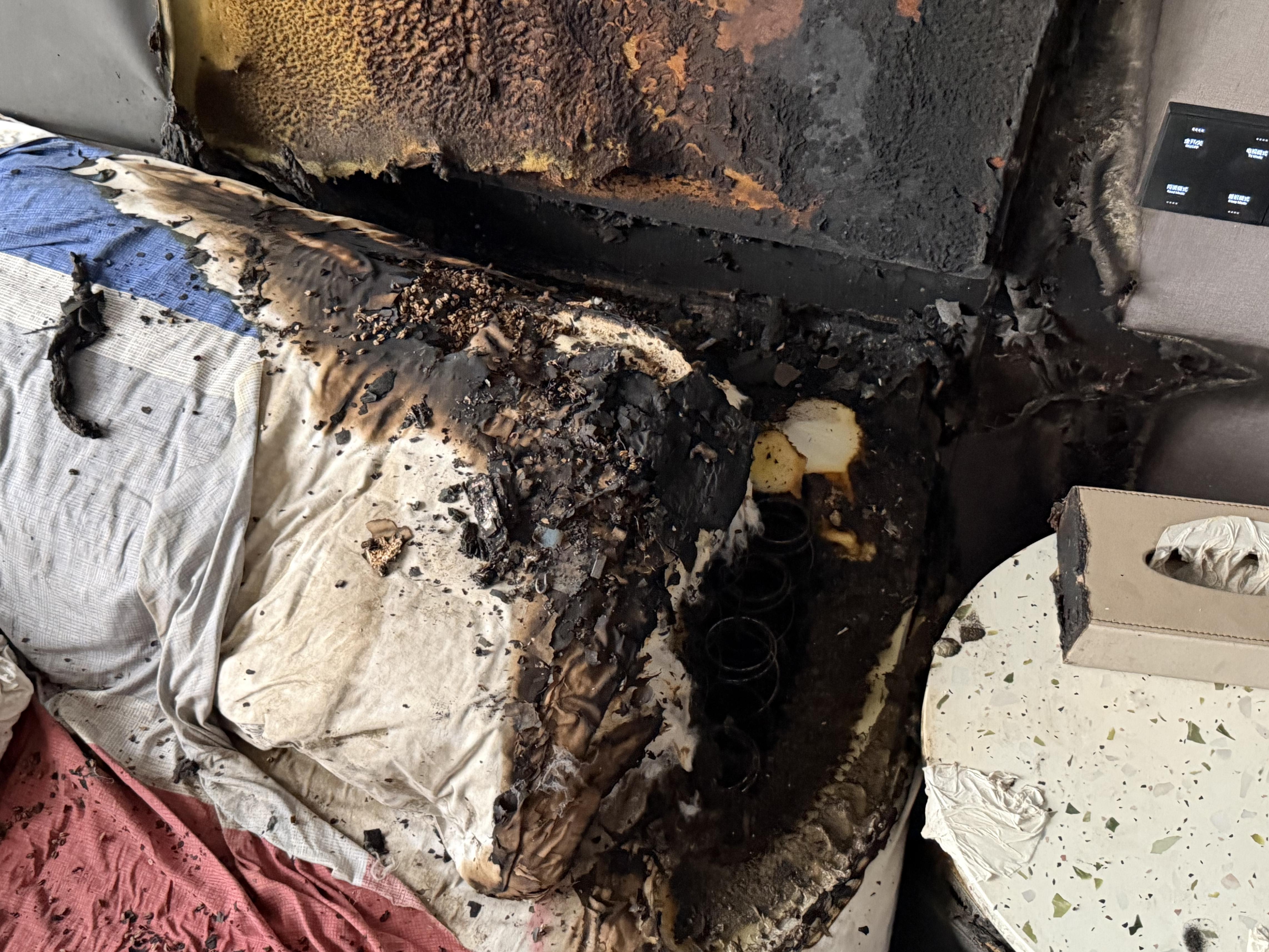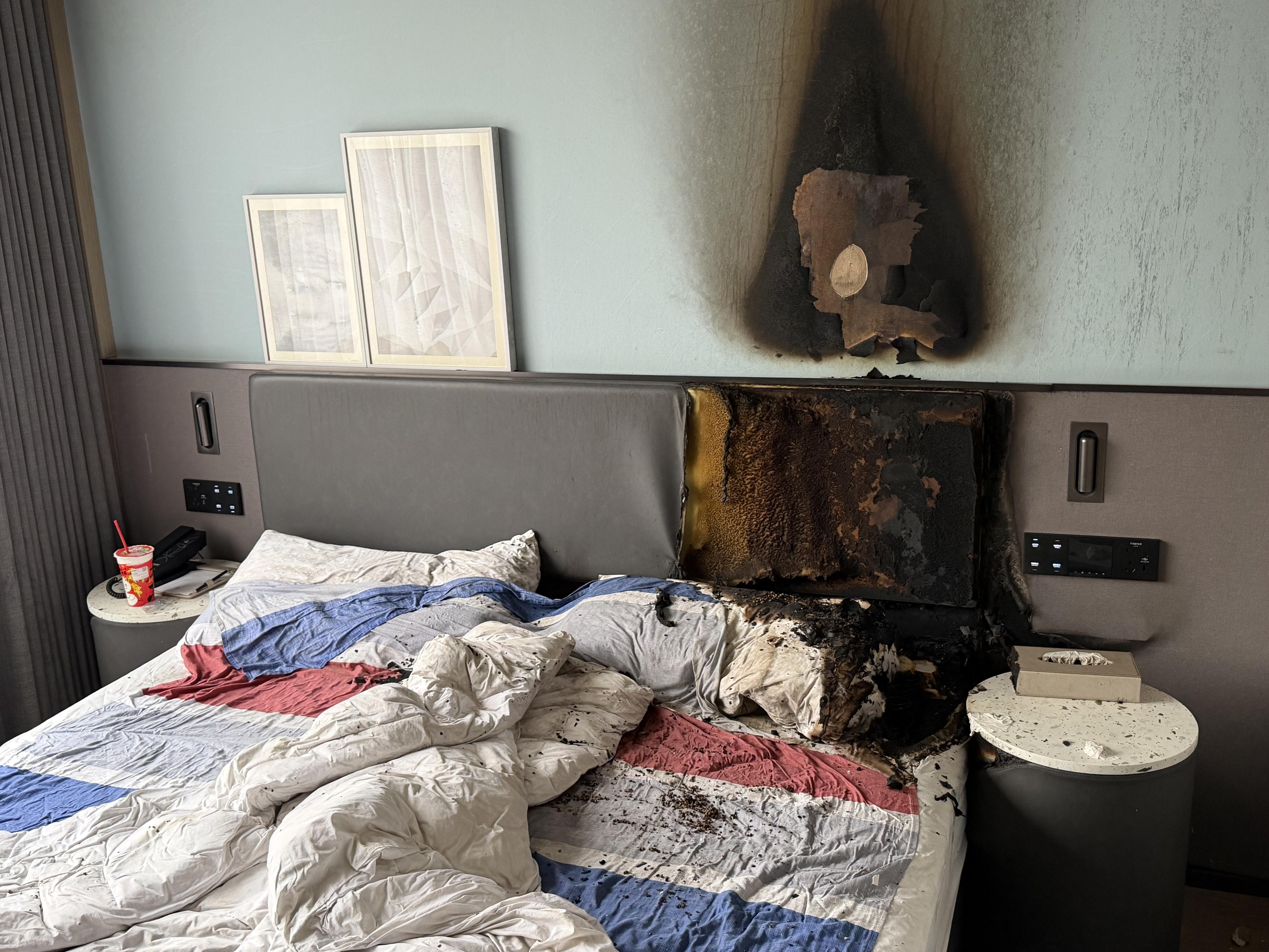 记者在现场看到,起火部位在床头一侧,过火后,墙面被熏黑、被褥被烧毁,床垫被烧得暴露出了内部的弹簧。