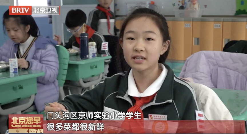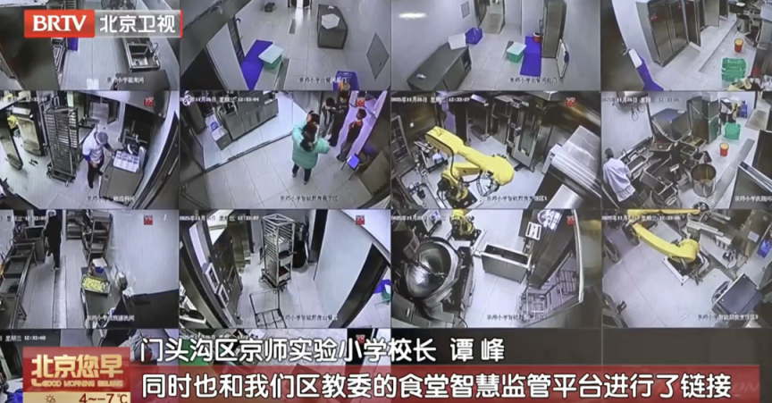 门头沟区京师实验小学校长谭峰说,学校用了大概60多天的时间,变身为自办的新型AI食堂,结束了多年来学生的午餐依靠外供的形式,同时也和我们区教委的食堂智慧监管平台进行了链接,餐食制作是不是规范,这些厨工是不是规范,都能得到监控。