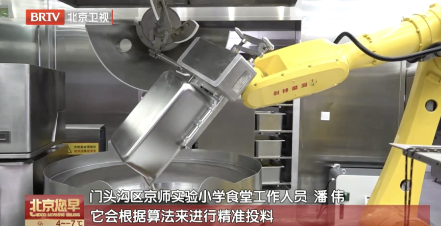 11月26日,北京市门头沟区京师实验小学AI智慧食堂系统正式投用的第三天,通过人工智能算法调度,层架车将处理好的食材运送至炒锅。油热瞬间,机械臂精准投料,锅中食材翻飞,4分钟后香气四溢的青椒土豆丝便出锅了,整个流程从抓取到出品仅需10分钟左右。