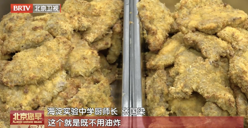 海淀实验中学厨师长张国梁说,现在的“三减”,就是低盐、低油、低糖,更符合健康标准,以前的鱼排、鸡排必须得油炸,现在不用油炸,出来的效果比油炸的还好一点。