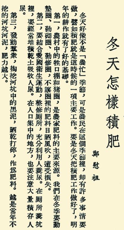 当然,落叶也不是一无是处,当时人们会将其用于沤肥。北京日报曾多次刊登文章,教农民如何积肥。比如,1952年12月15日北京日报4版《冬天怎样积肥》一文中提到:把落叶、牲口粪等堆在一起,沤成肥料。冬天的沤肥,肥素特别多。1954年5月21日北京日报3版《郊区农民试用尿肥已获初步成绩》也提到:堆肥是用农家的废物,如蒿秆、杂草、落叶、各种渣子和一些粪尿等制成的,堆积的方法和厩肥相似。在物质匮乏的年代,农民们利用落叶等废弃物自己动手积肥,为农业生产打下了基础。
