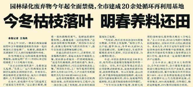 目前,全市园林绿化废弃物已实现100%禁烧:在山区,任落叶自然腐烂、缓慢分解,实现保水保墒的作用;在城市道路和居民区,落叶则被就地粉碎和收运,进行集中处置,开展循环利用。