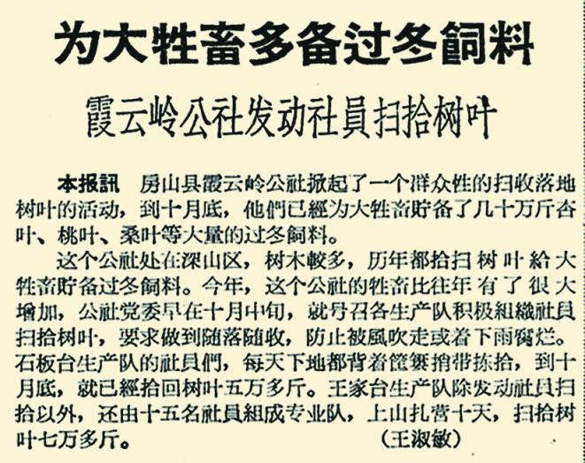 那些年,落叶还有一种用途——作为动物饲料。树木落叶的季节,北京动物园的职工会收集很多桑树、柳树、榆树等树木的叶子,晒干后储藏起来,到严冬季节代替干草掺在料里喂羊和骆驼等动物。用树叶做饲料可以代替同样重量的干草,干草每百斤价值4元,动物园职工收集的3.2万多斤树叶为国家节省了1200多元。(1955年11月16日《北京日报》3版,《树叶可代干草喂牛羊》)为了储备大牲畜过冬饲料,1960年,房山霞云岭公社掀起了群众性扫收落地树叶活动,要求随落随收,防止被风吹走或者下雨腐烂。石板台生产队的社员们每天下地都背着筐篓捎带捡拾,拾回树叶5万多斤。王家台生产队除发动社员扫拾外,还由15名社员组成专业队,上山扎营10天,扫拾树叶7万多斤。(1960年11月19日《北京日报》2版,《为大牲畜多备过冬饲料》)