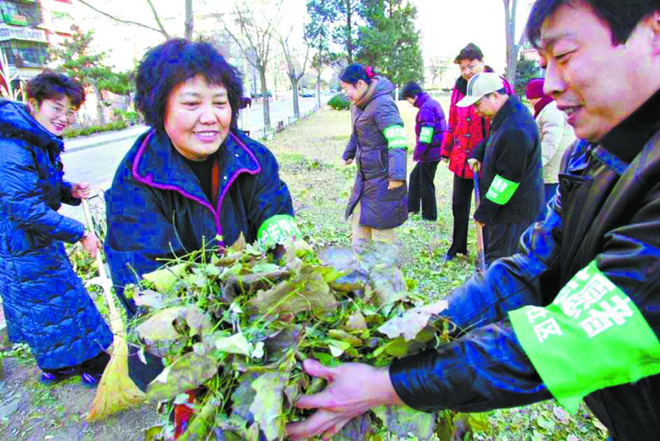 2005年,环保志愿者将清扫的落叶集中进行环保处理。吴镝摄