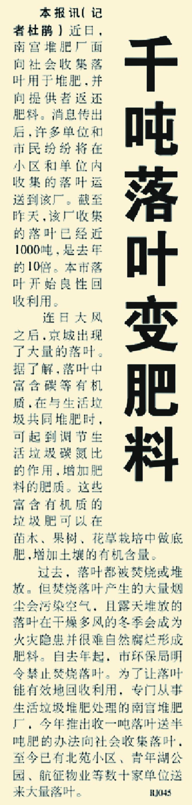 2002年,北京首座垃圾堆肥厂——南宫堆肥厂面向社会收集落叶,然后进行处理,转化成可利用的肥料,其办法为:收一吨落叶送半吨肥。消息传出,很多单位和市民纷纷将在单位和小区内收集的落叶运送到该厂。截至2002年11月中旬,该厂收集的落叶近1000吨,是2001年的10倍。(2002年11月14日《北京日报》5版,《千吨落叶变肥料》)
