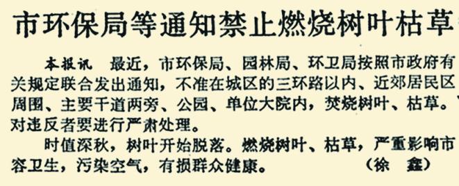为改变这种状况,1983年,市环保局、园林局、环卫局联合发出通知,不准在城区的三环路以内、近郊居民区周围、主要干道两旁、公园、单位大院内,焚烧树叶、枯草。违反者要进行严肃处理。(1983年11月6日《北京日报》2版,《市环保局等通知禁止燃烧树叶枯草》)