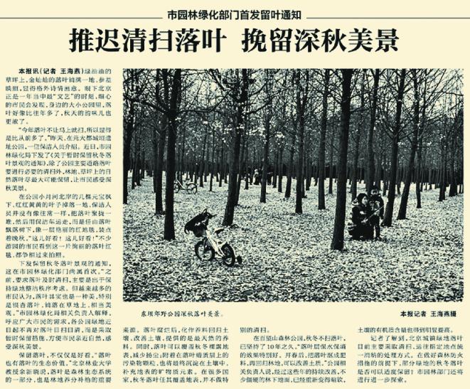 2017年,市园林绿化局下发《关于暂时保留秋冬落叶景观的通知》,要求除公园主要道路落叶要进行必要的清扫外,林地、草坪上的自然落叶尽最大可能保留,让市民感受深秋美景。(2017年11月13日《北京日报》6版,《推迟清扫落叶 挽留深秋美景》)那年初冬,各大市属公园构成一幅幅浪漫图景:朱红的枫叶、金黄的银杏叶随风飘落,散落在树下绿地、景观小径,五彩斑斓。(2017年11月17日《北京日报》10版,《周末到市属公园看“落叶缤纷”》)