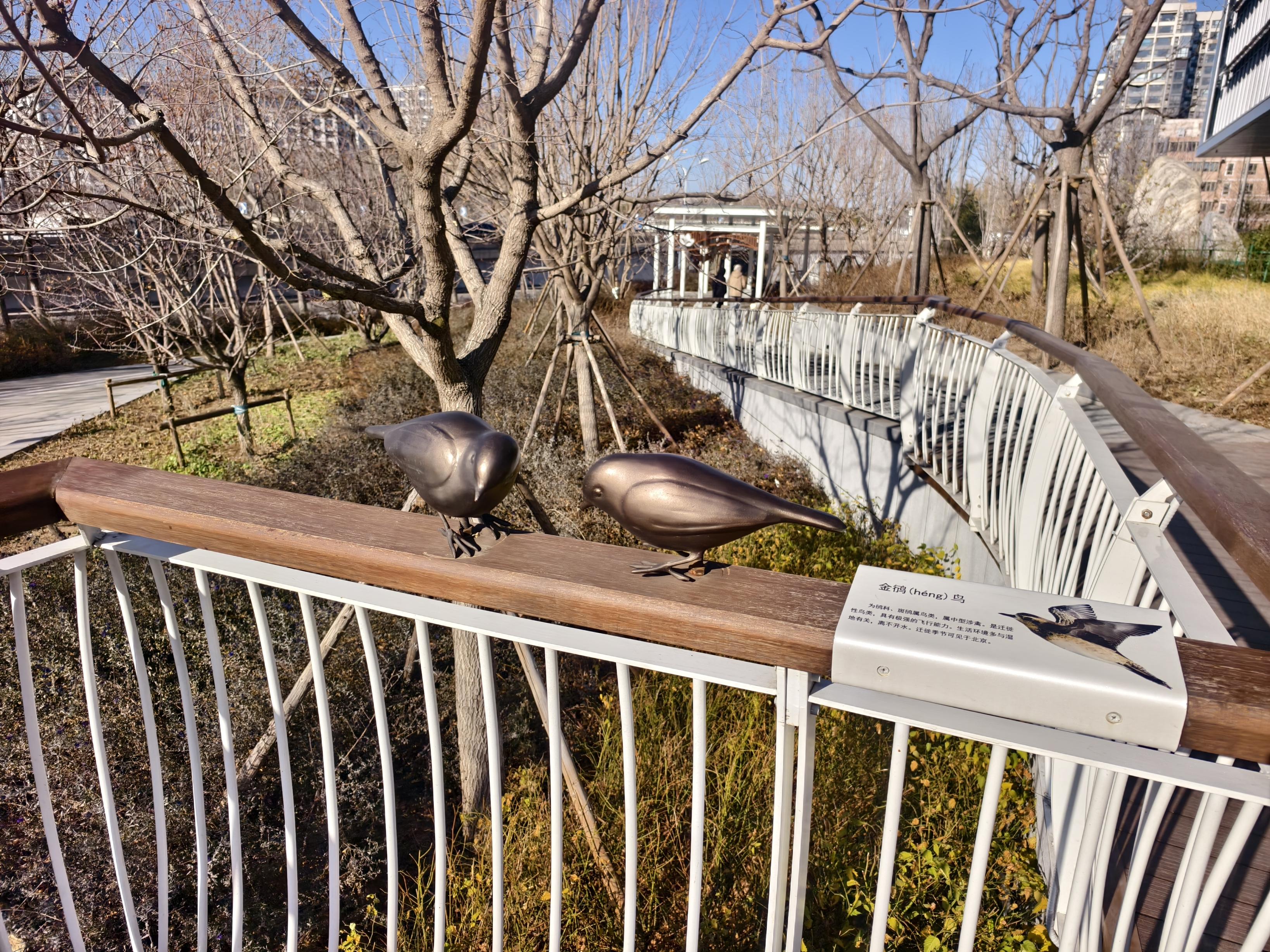 冬日午后,昆玉河水静静流淌,河东岸玲珑路与蓝靛厂南路交叉路口南侧绿地中,休闲廊道或沿地面蜿蜒或架在空中,灰褐色的扶手,白色的栏杆,宛若流动的音符。