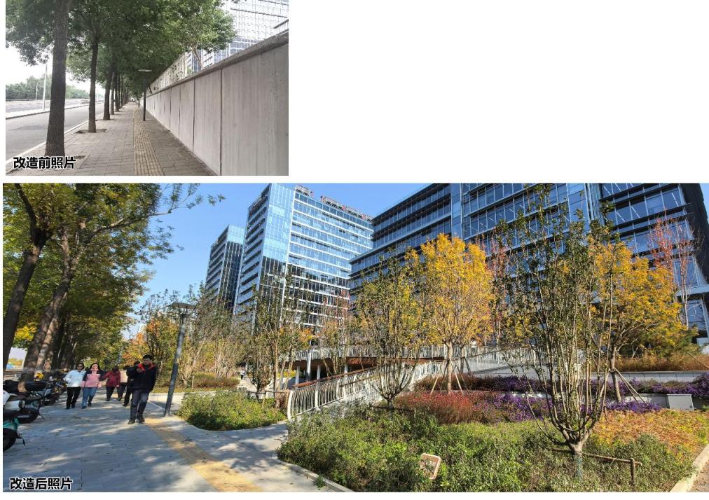 “此前,蓝靛厂南路沿着人行道有长约1000米的市政高墙及围栏,矮的路段半米高,高的地方能有5米,将行人与路侧绿色空间阻隔,行走在人行道上,压迫感极强。”海淀区园林绿化局相关负责人介绍,近年来,高墙之上陆续新建了中国电建科创产业园、中国电科科创产业园,还有原有的裕惠大厦写字楼、裕龙酒店等办公经营类场所,“打开围墙”的需求越来越强烈。如今高墙不见了,高墙内原有的绿色空间,通过增加种植台地、台阶、坡道等方式,化解了原有高差,让人能够轻松实现绿地与市政道路的切换。