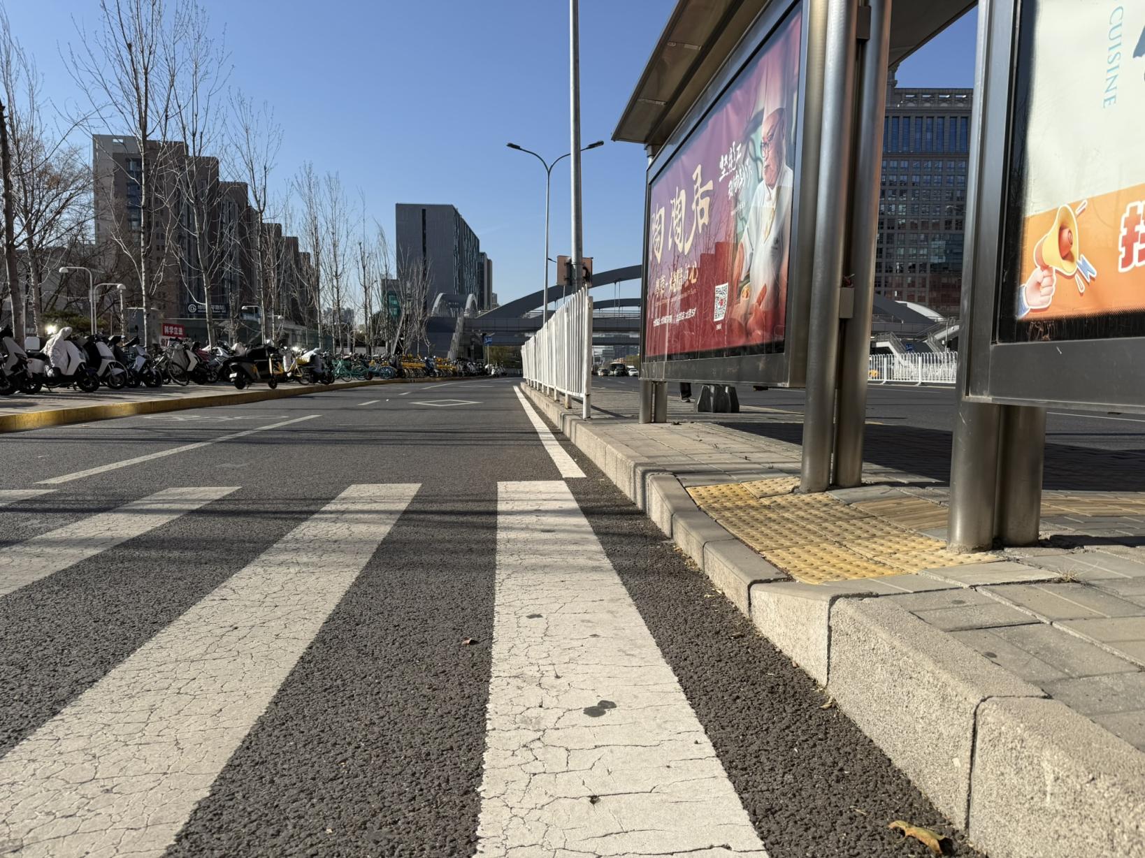 根据老高的指引,记者来到了6号线青年路站,地铁站的无障碍电梯位于路口东南角的C口旁,而老高所说的公交站台,则是地铁出口以东约50米的青年路口东站。记者在现场注意到,这座公交站并非没有进行无障碍设计。公交站在站台与非机动车道之间设置了坡道和盲道,然而令人费解的是,站台的坡道并没有延伸至与辅路路面平齐的高度,最低处反而还留有十来厘米的高度差。小小的一道坎儿,导致了站台无障碍设计“失效”。