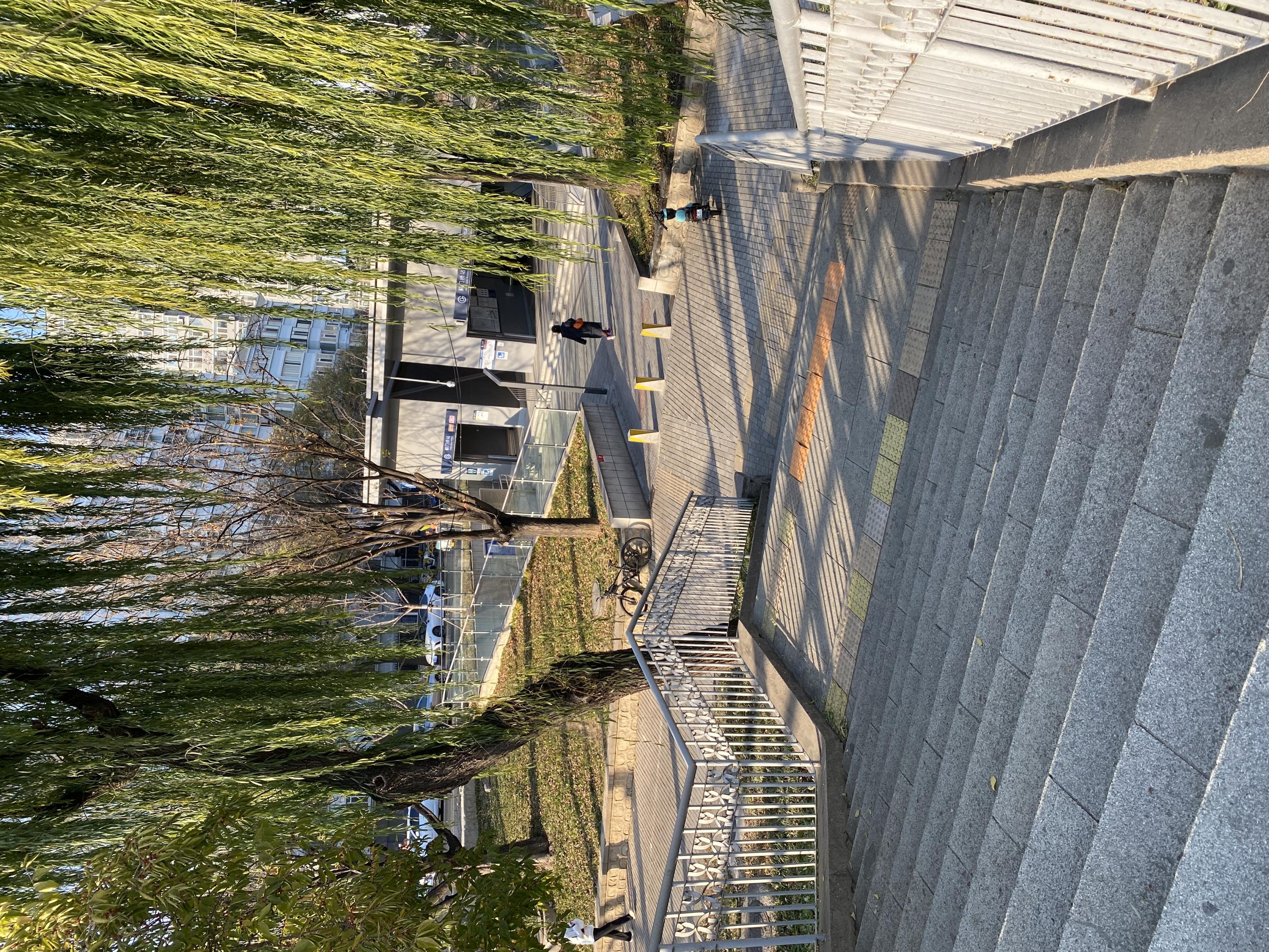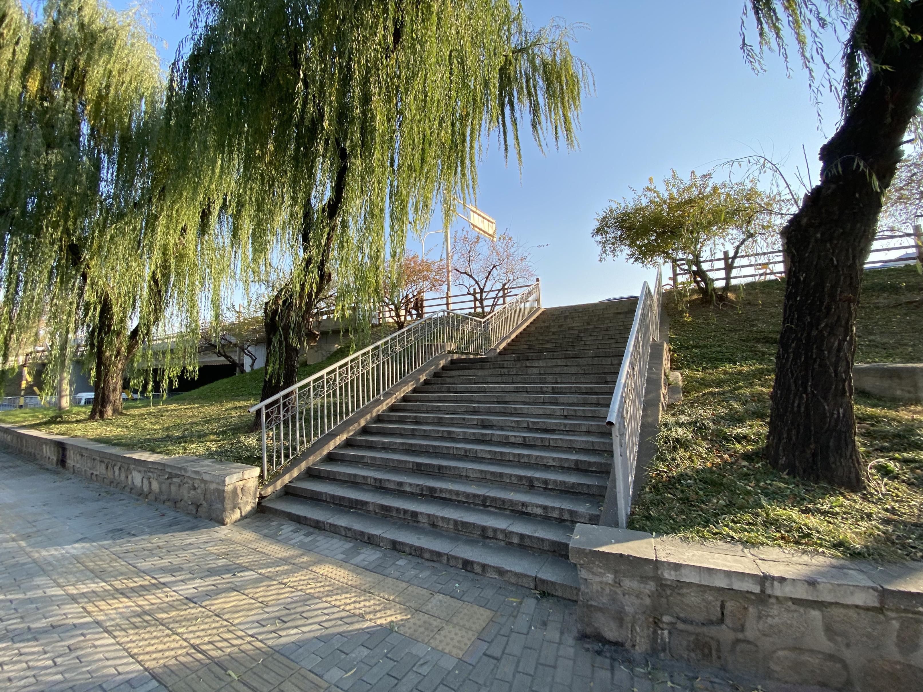 由于A口位于桥区低处,与北三环西路有约5米的高度差,出站的乘客想要到达路面,只能向上爬台阶。其中,正对着出站口的台阶直通北三环蓟门桥上,一路共有27级台阶。而去往蓟门桥西北角的市民,则要穿过一个桥洞。但桥洞西侧的人行道同样没有坡道,向西走的乘客要爬7级台阶才能到达路面,向北走的乘客更是要爬20级台阶才能到达路面,给无障碍出行带来了极大困难。
