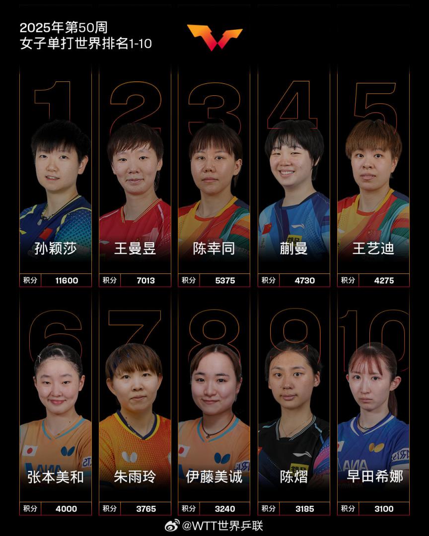 女子单打,中国队球员孙颖莎、王曼昱、陈幸同、蒯曼、王艺迪位列前五,陈熠位列第九。