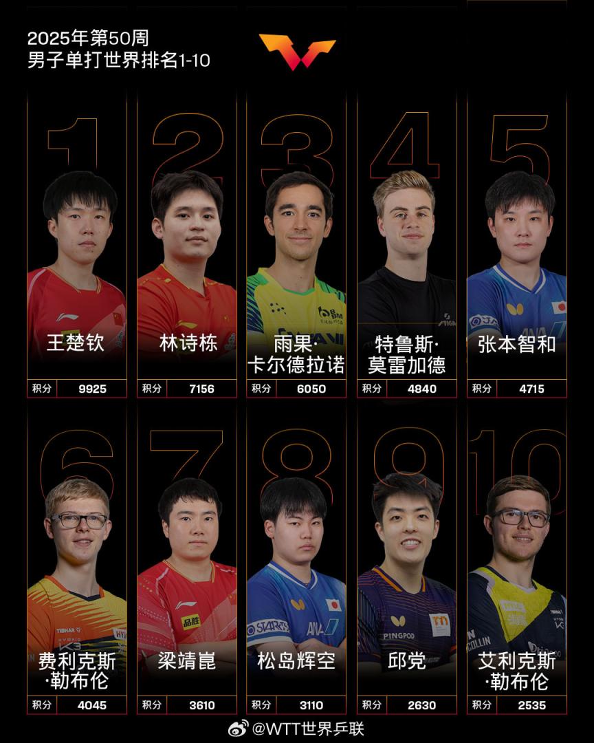 男子单打,中国队球员王楚钦、林诗栋位列前二,梁靖崑位列第七。