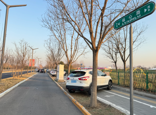 不仅路侧人行道被占,非机动车道和机动车道间的隔离带也成了司机见缝插针的“停车场”。在绿心路公交站牌边上,一辆灰色的小轿车不偏不倚地停在了隔离带的正中央,挤占了等车人的位置。部分主辅路出入口的隔离带延长线也成了停车的“车位”。只见绿野森林乐园北口向东100米左右的绿心路辅路出口,四辆小轿车停在隔离带延长线上,导致出入辅路的车十分困难。记者在现场观察的30分钟内,没有一辆车开走。