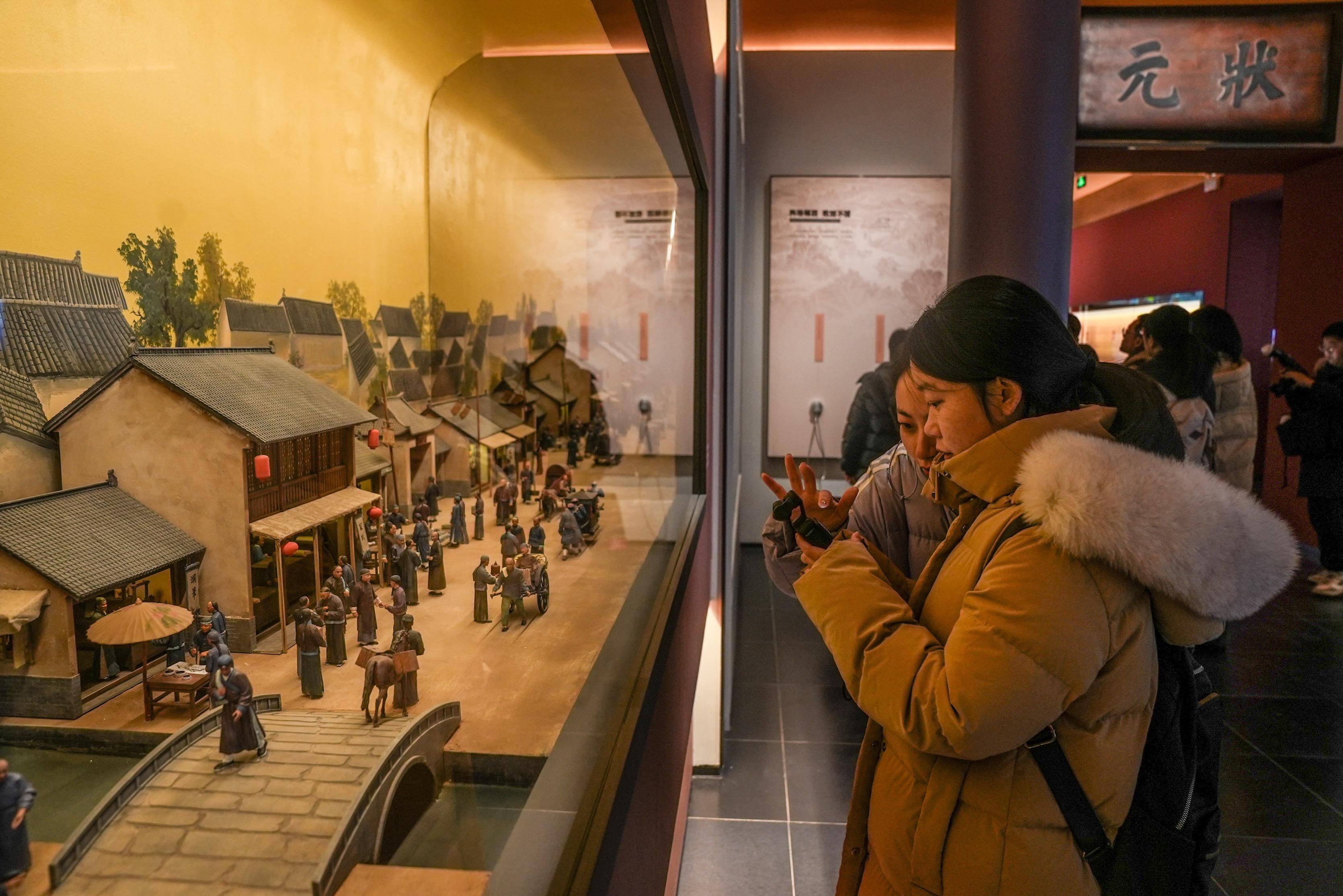 古代士子考试的“格子间”也被搬进展厅。“考棚号房是考生考试的地方,又是考生吃住的场所。”李晓頔说,观众可以体验科举考试全流程,尝试将书桌拼接成简易床铺,“士子需要在这里住9天,答3场考试。”
