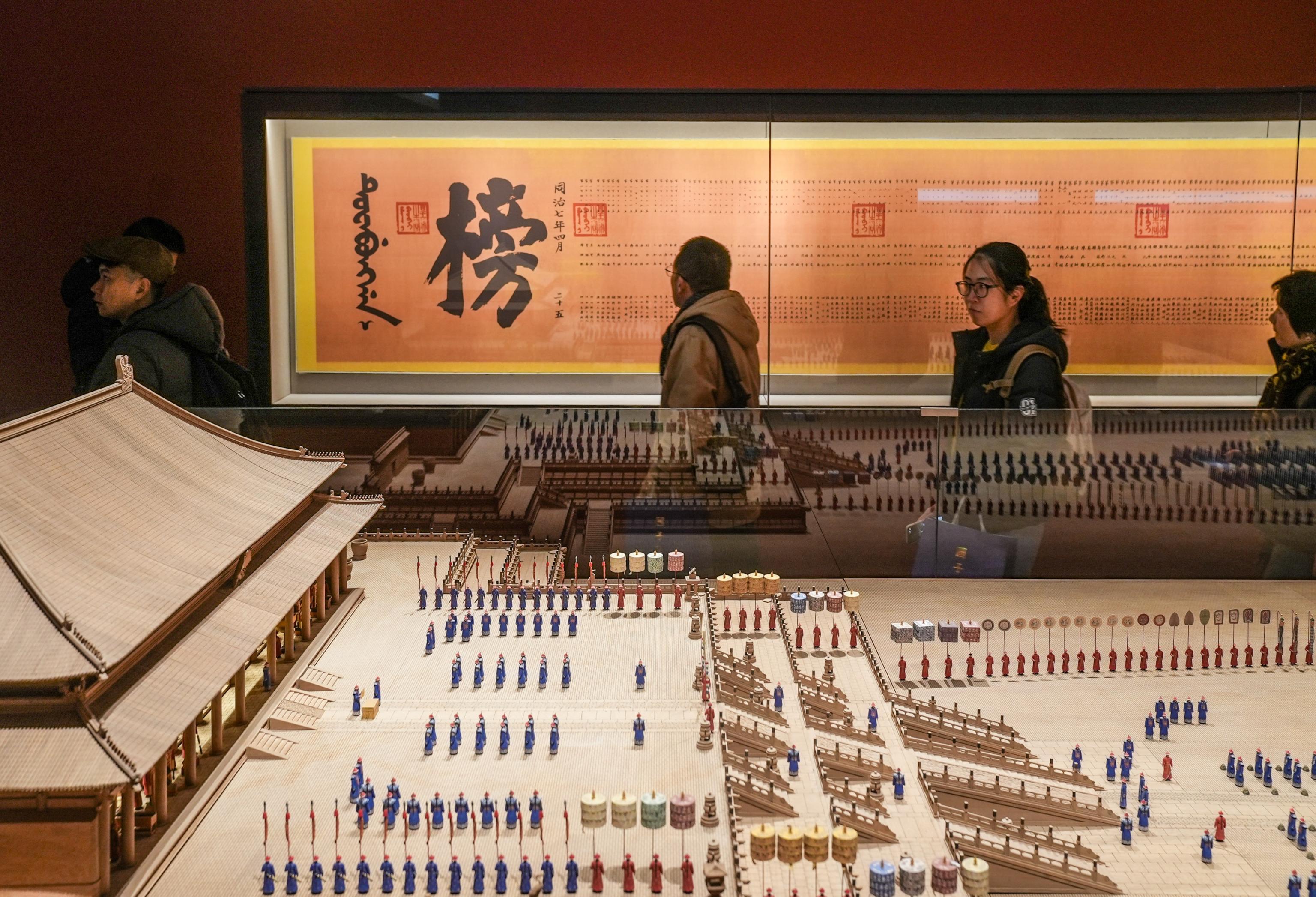 与升级前比,展览最大的亮点是增加了互动体验。展览第二部分,观众可以“参加”清代科举考试,先后体验童试、乡试、会试、殿试四级考选场景。“搭配展出一批馆藏珍品,方便观众了解清代科举考试流程。”李晓頔说,清代刻本《钦定科场条例》是专为规范科举考试而制定的法律。“这套条例在顺治二年首次颁布,由礼部主持编纂,后不断增修,至光绪时期已达59卷。”