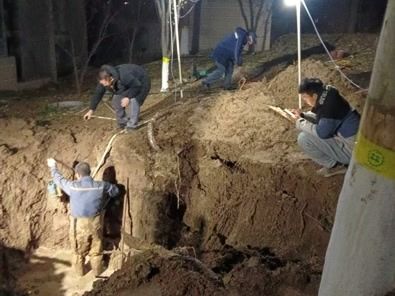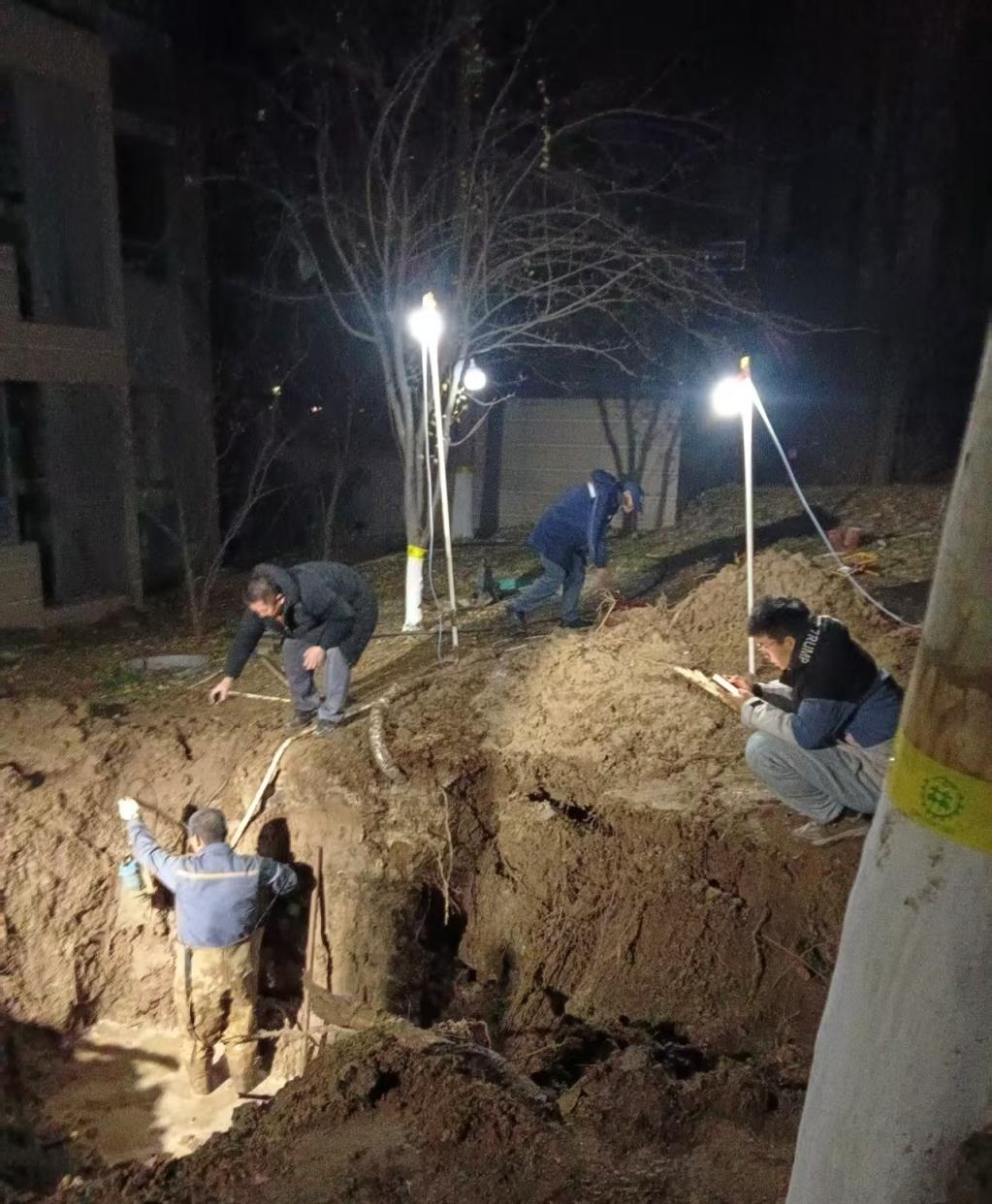 经现场细致检查,抢修人员最终确定漏点位于2号院2号楼南侧绿地下方。此处供水管道因年久老化加之低温影响而发生破裂。经过挖掘机挖掘后,抢修人员发现水管处有持续涌水现象,漏水和泥土形成了泥浆,给作业带来极大挑战。因地下管道情况复杂,挖掘机无法继续施工,几名物业工人师傅便跳入泥浆中,顶着刺骨的寒风进行维修处理。经过紧张作业和认真调试,抢修工作于15日清晨5时许顺利完成。