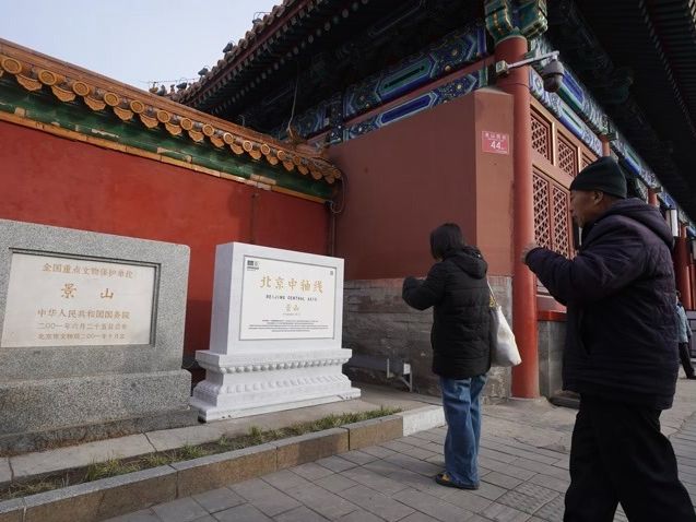 12月16日,北京中轴线世界遗产碑(景山)正式亮相景山公园南门承载着六百年历史的“万岁门”前,与原有的“全国重点文物保护单位”标志石碑并肩而立。