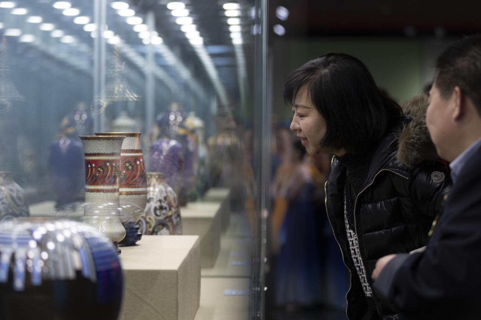 景泰蓝,又称“铜胎掐丝珐琅”,自元代沿丝绸之路传入中国,经明清两代宫廷锤炼,成为代表中华工艺美学高度的艺术形式之一。2006年,景泰蓝制作技艺入选首批国家级非物质文化遗产。展览开篇“国礼重器·文明对话”板块,以庄重典雅的展陈氛围,呈现了“繁花似锦”赏瓶、四面方尊、“盛世欢歌”大瓶等30余件曾在APEC、“一带一路”国际合作高峰论坛等重大国际场合亮相的国礼珍品。