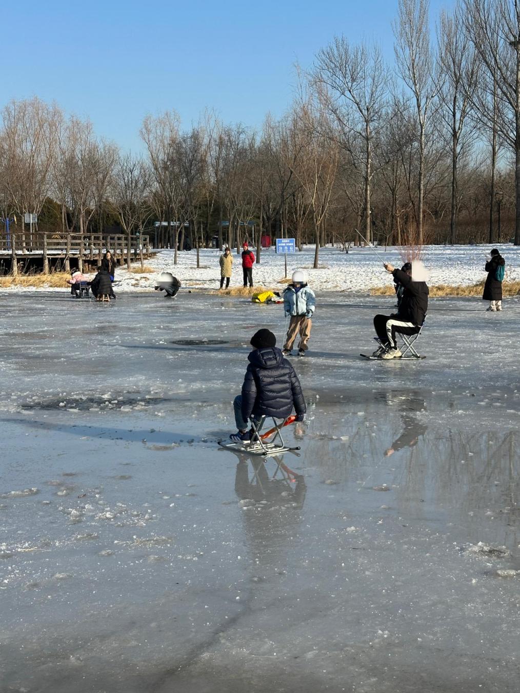 这是上周六下午2点,朝阳公园的这一块湖面,还没有完全冻上,站在岸边就能清楚地看到冰面中露出的湖水。滑冰的人群有二三十人,而且人数还在不断上升。有人在速滑,有人在玩冰球,有人原地旋转,还有人坐在冰车上拍照。