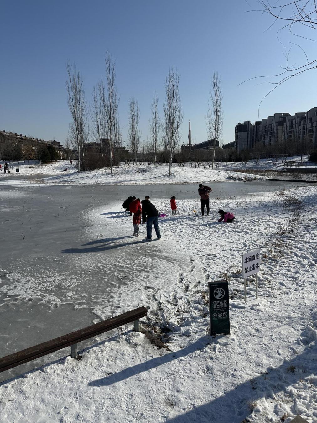 记者也来到东区,但这里并非完全背阴,正午时分,暖阳洒落冰面,可以看到几处浮着碎冰的冰窟窿。一位家长拿着半米多长的冰叉,从一个冰窟窿里向下探去,却始终没触底,随后他又找来一根一米多长的木棍向下测试,“你看,这儿得1米多深呢!你要是掉下去了,能没过身子!”这位家长开玩笑似的跟正在滑冰车的儿子说道。他的一番话引来儿子好奇,男孩用冰叉又猛戳冰窟窿边缘,冰裂声阵阵响起,但明知危险的父亲并未上前阻止。