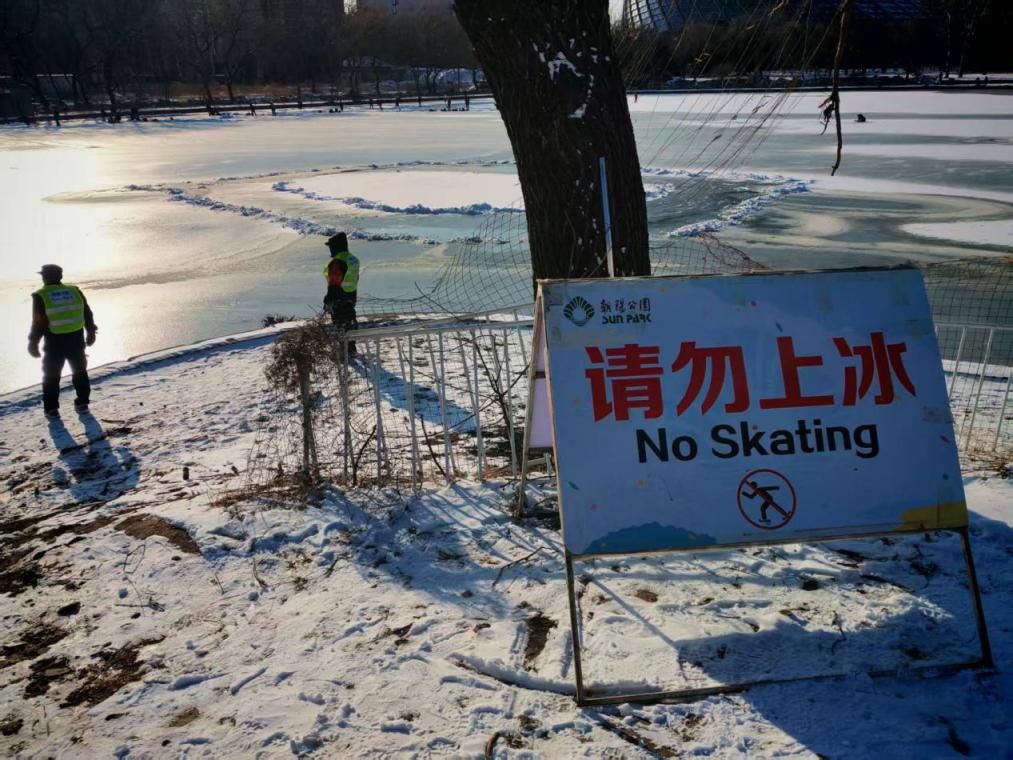 本周一下午,朝阳公园在其官方公号上发文——冰面危机暗藏,切勿私自上冰!公园提醒:“目前公园湖面冰层较薄,私自上冰的行为存在严重安全隐患!为了您和家人的安全,请务必远离冰面,切勿在冰上行走或嬉戏。”