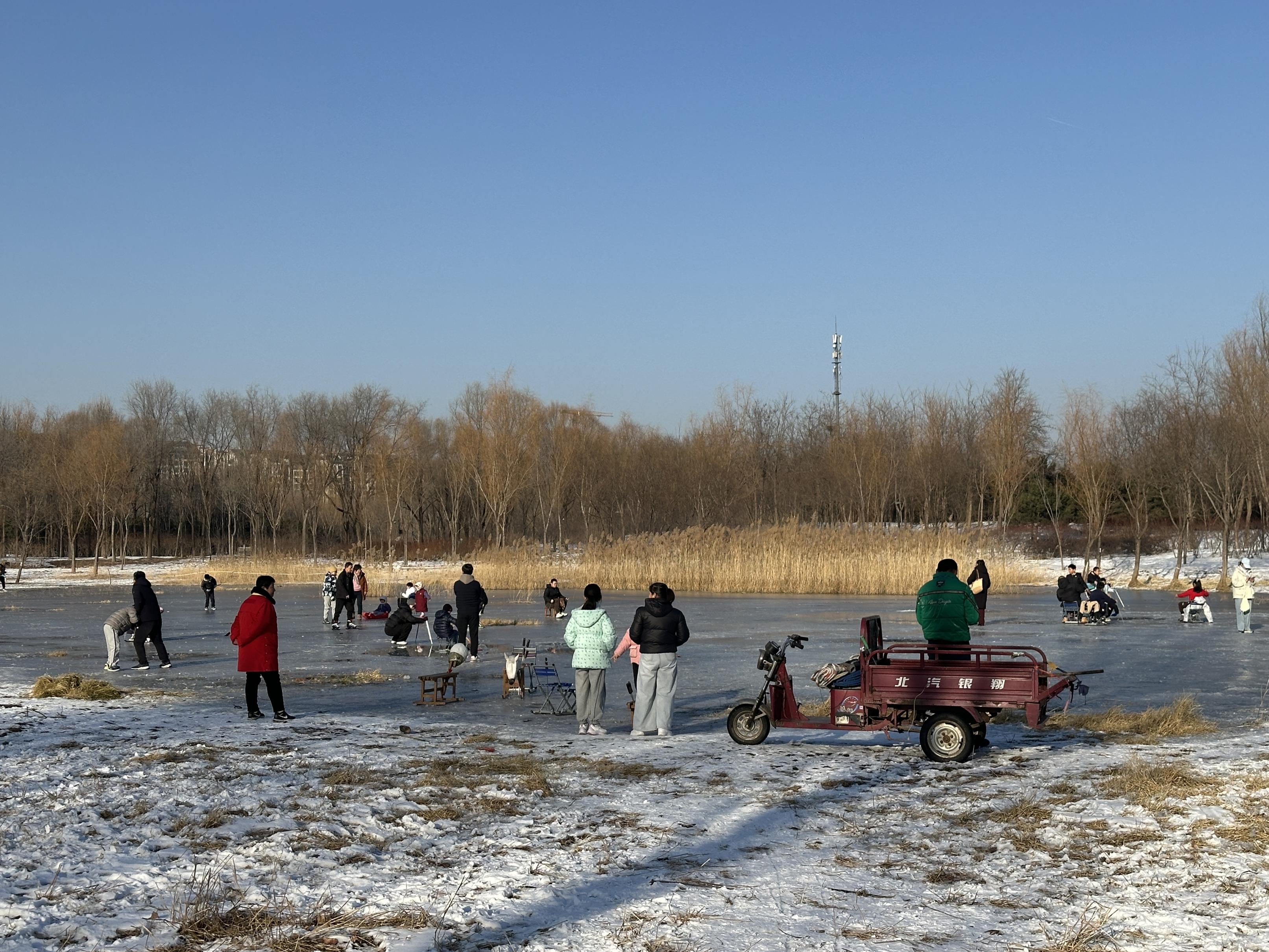 “没事儿!放心!这里的水不深,南边这块最深也就30厘米,孩子掉下去也没事儿,顶多湿件衣服!”岸边,一名租赁冰车的商贩信誓旦旦地保证。他坦言,这个周末,是他今年第一次来这儿做冰车生意。眼下水面刚结冰,单靠天然上冻还不行,“这片能玩的区域,是我连着两个晚上浇水浇筑出来的。今年到现在气温偏高,天然结冰的冰面太薄,这么多人上去玩,早就塌了。”