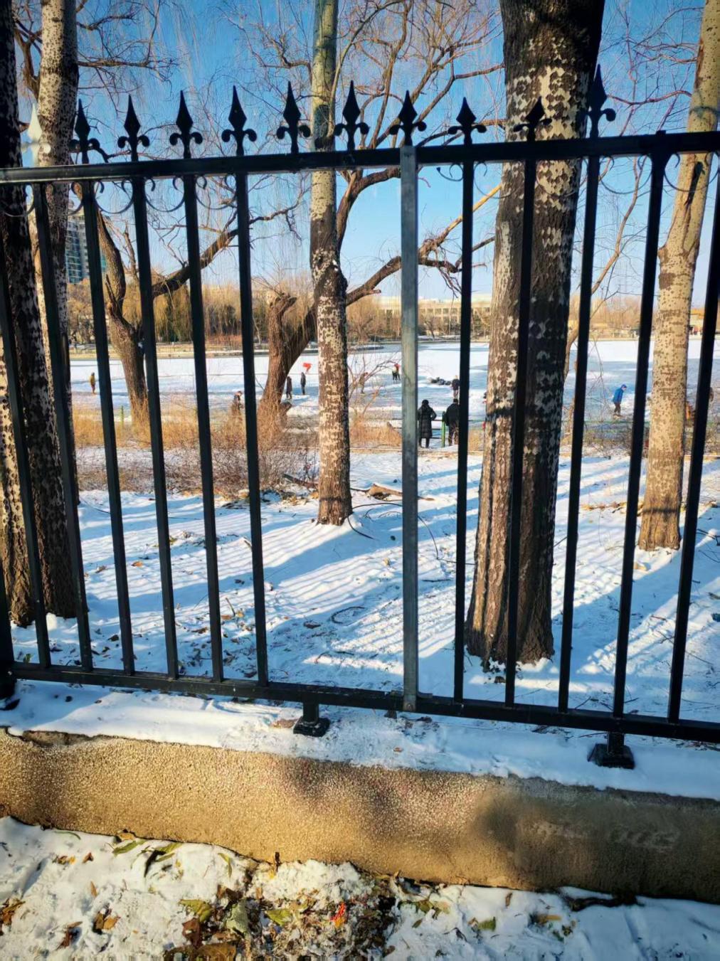 铁栅栏、高音喇叭和保安,对这些狂热的野冰爱好者起不到任何阻挡作用。湖的另一侧,有铁栅栏直接被卸掉了一根,方便滑冰者进出。记者询问其中一个大爷,他很清楚地表示:“这儿是野冰。”至于冰面是否安全,他留下一句“差不多吧”便匆匆离开。