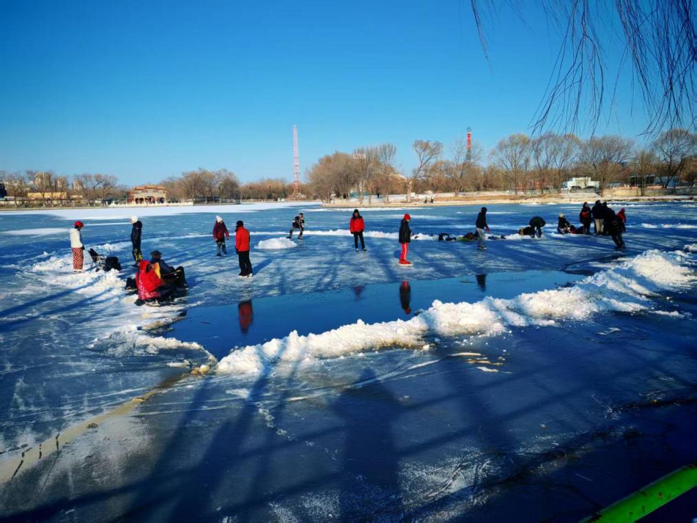 冰刀划过冰面发出清脆的声响,滑冰者镇定自若,完全不顾近在咫尺的冰缝和还没完全冻上的水面。当下,气温仍在0℃上下波动,北京城的各大正规冰场尚未开业,但野冰场已经热闹起来。