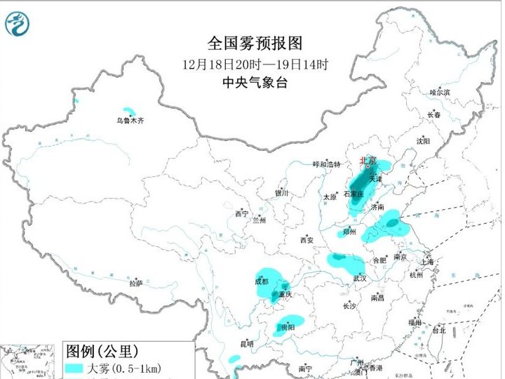 预计,18日夜间至19日上午,北京、天津、河北中南部、河南东北部、山东南部、江苏北部、安徽北部、湖北北部、四川盆地中南部、贵州中部等地的部分地区有大雾,其中,北京中东部、河北中南部、天津西部、山东南部、湖北北部、四川南部、重庆西南部等地的部分地区有能见度低于500米的浓雾,局地有能见度低于200米的强浓雾。