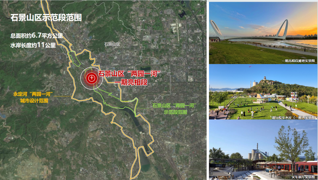 作为京西“两园一河”协同发展的核心承载区,石景山区在“两园一河”规划中涉及面积达38.1平方公里,占总范围的四成以上,其中6.7平方公里示范段以“一轴一带领门户,三区九段营彩岸”的空间格局,绘就山水相融的活力长卷。