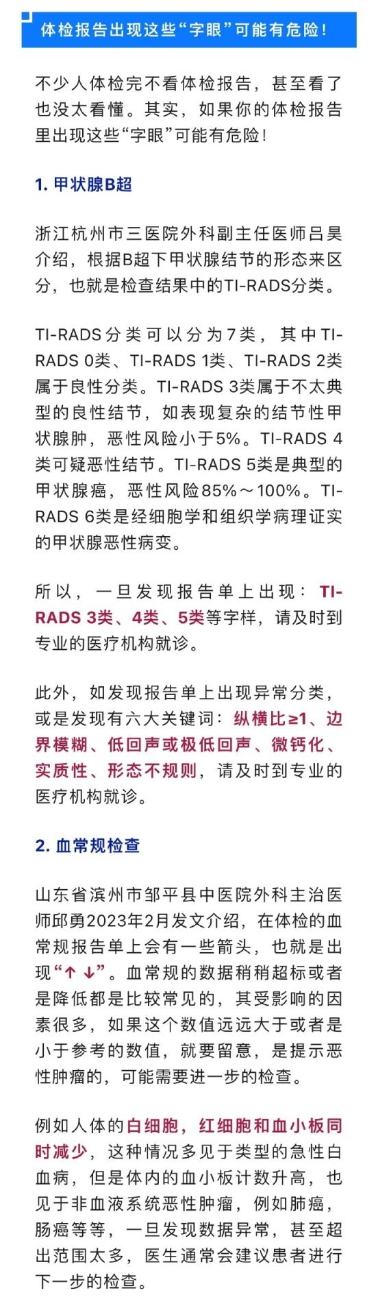 不少人体检后根本不仔细看报告,或即使看了也一知半解。请注意:如果体检报告里出现以下这些“字眼”,一定要提高警惕——它们可能是身体发出的“危险信号”,需及时跟医生咨询。