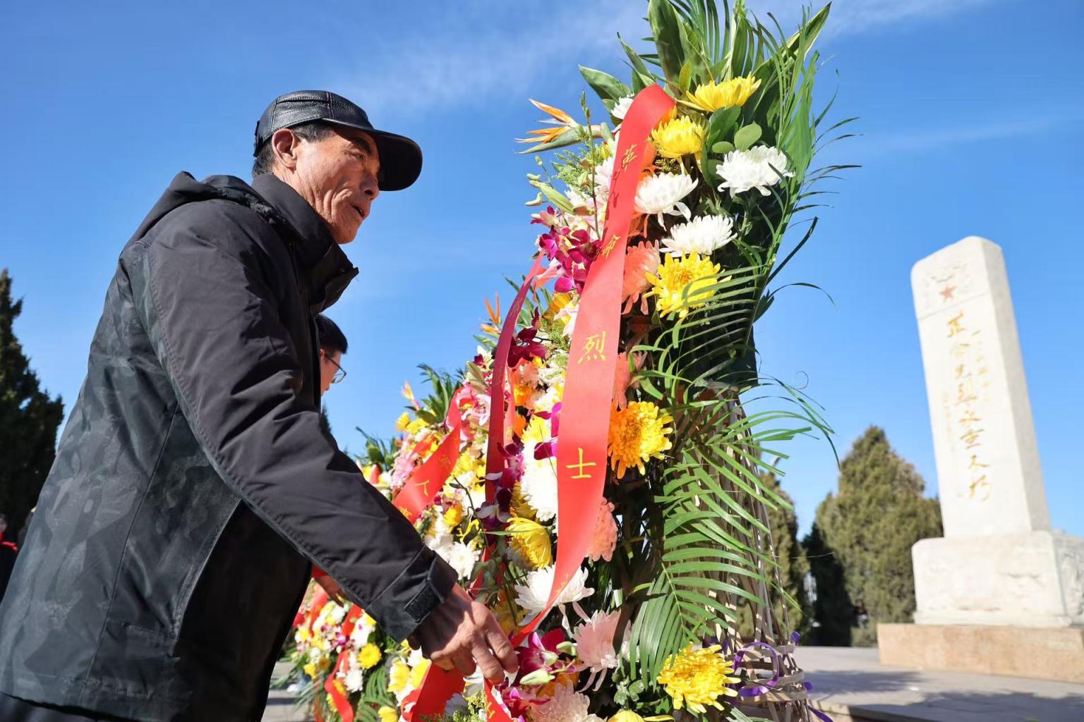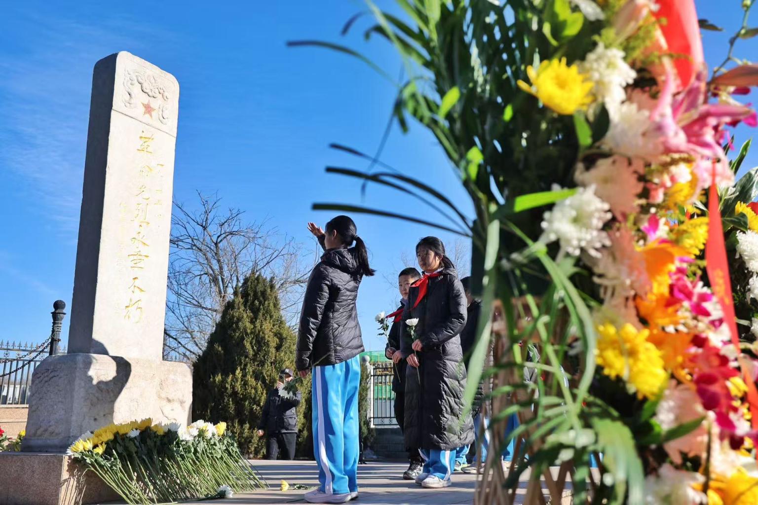 大家整齐列队,面向烈士墓碑肃立默哀。凛冽的寒风中,每个人的脸上都写满肃穆与崇敬,以此寄托对英烈的深切哀思。默哀完毕,军地代表与学生代表依次上前,向烈士敬献鲜花,朵朵鲜花寄托着后辈对先烈的无限缅怀。