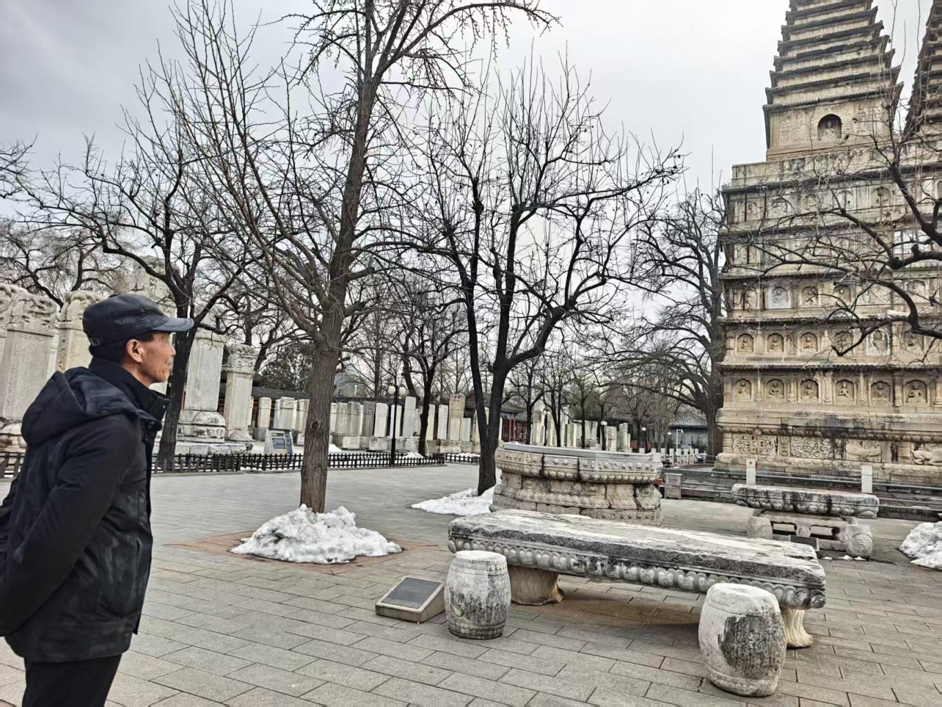12月19日下午,曹国华来到伯父当年战斗过的地方——北京石刻艺术博物馆(五塔寺)。讲解员指着金刚宝座塔介绍:“塔身上的那处破损,可能就是当年炮火留下的印记。”曹国华伫立在塔下,望着那些痕迹,神色凝重。
