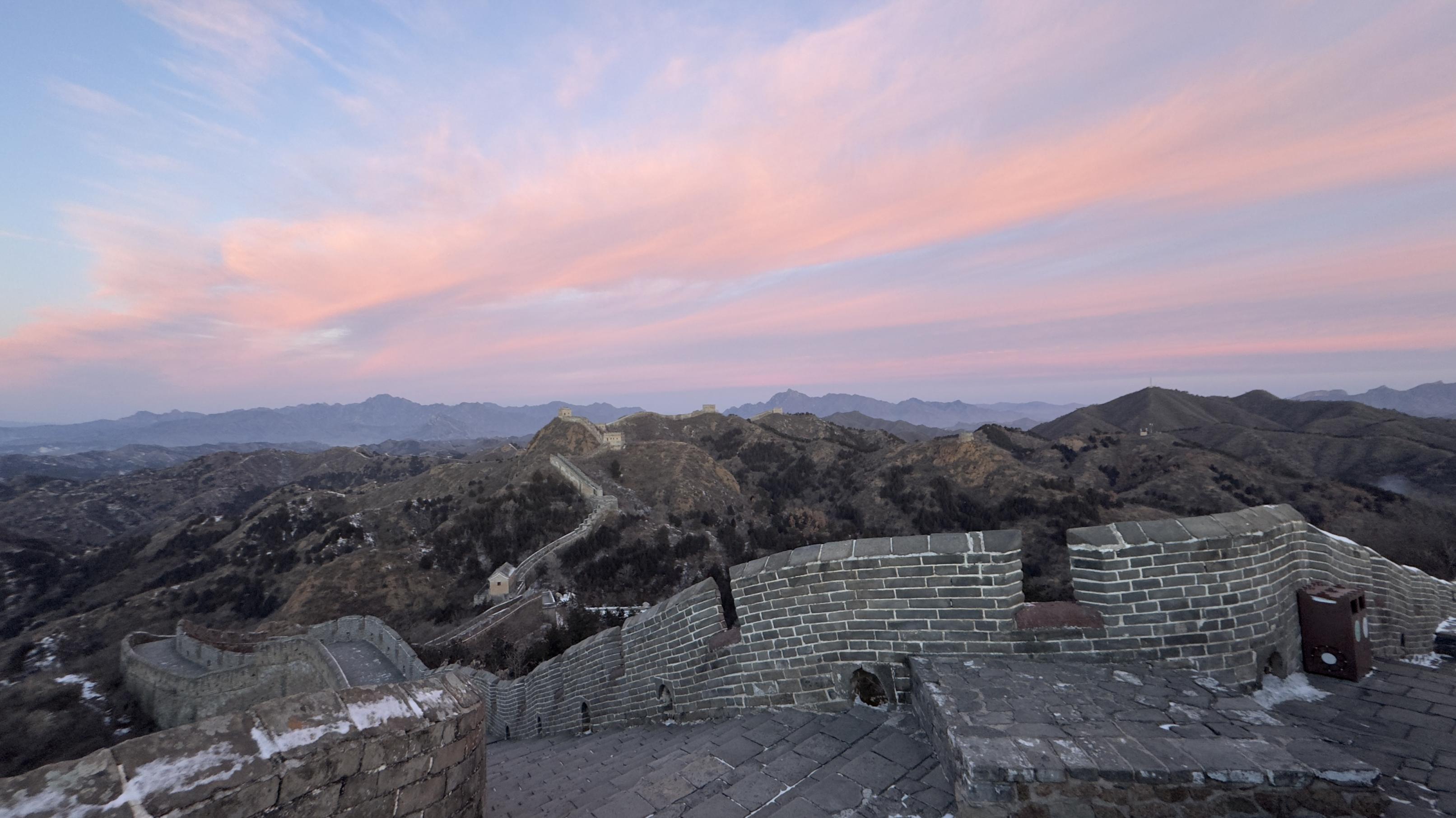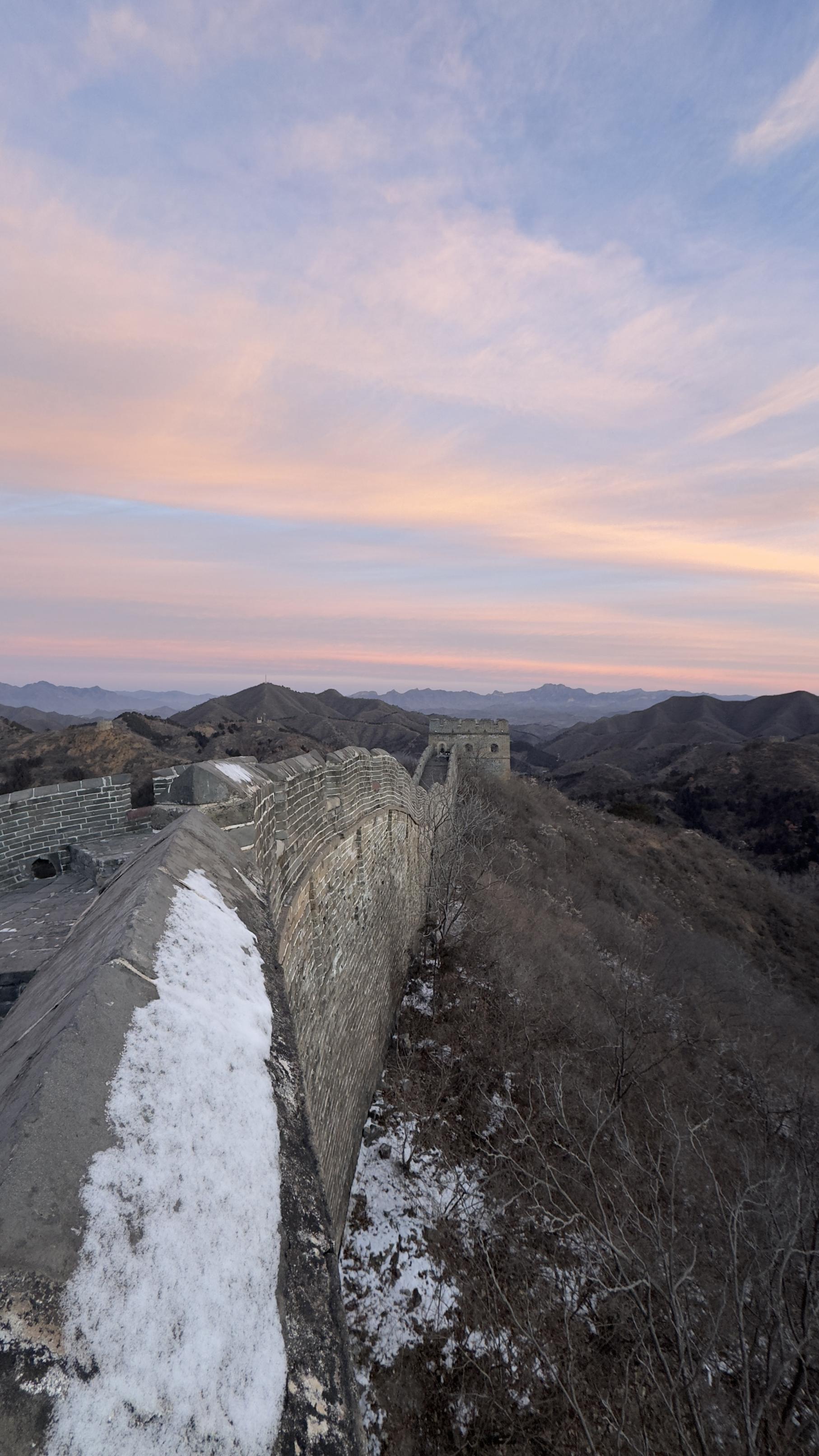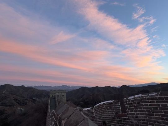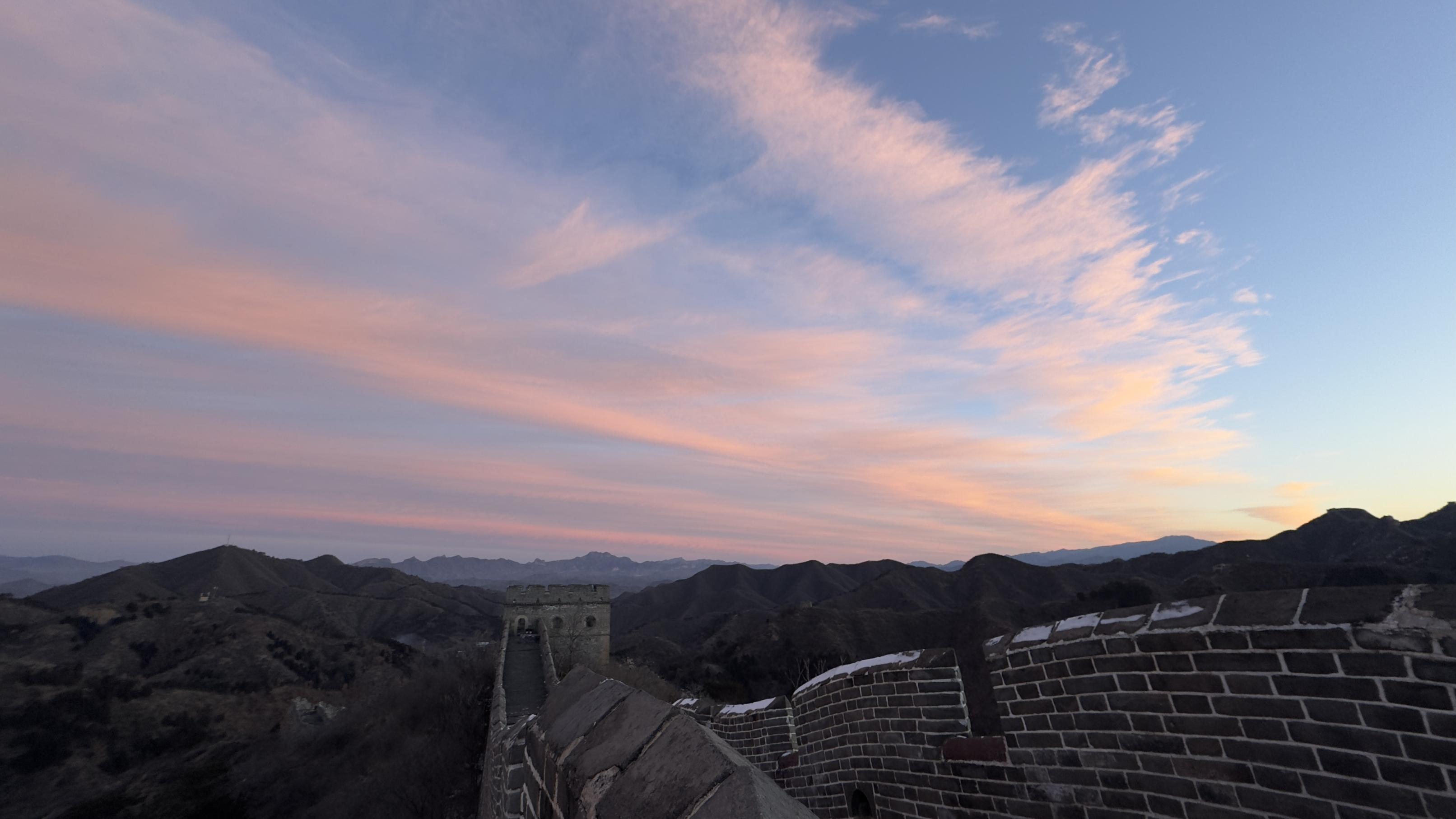 12月24日,雪后清晨,河北省滦平县的金山岭长城,出现绚烂夺目的朝霞景象。