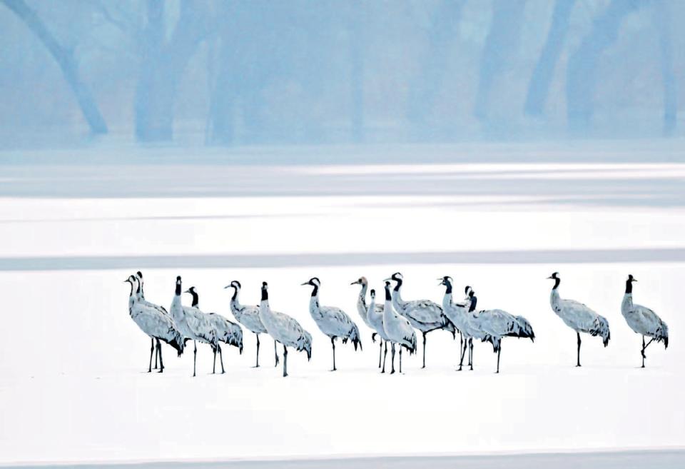 灰鹤在唐指山水库集群停歇。