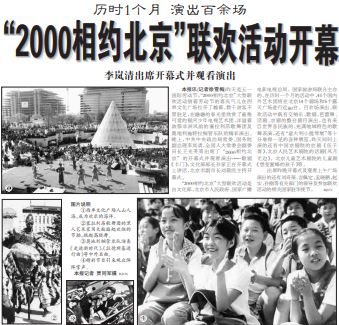 进入新世纪,街头文化演出、社区文化活动越来越红火。但要说最让人激动不已的露天演出,还要数庆祝北京申办2008年奥运会成功的那场大型露天联欢晚会。