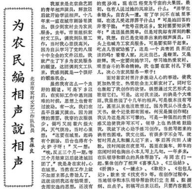 与观众的近距离接触,也为露天演出的演员们提供了更多火热的生活素材。青年相声演员贾振良在下乡演出时,被农村许多激动人心的事迹激起了创作欲望。他和同志们一起创作了《喜事儿》《三仙姑》《折腾》等不少相声,受到热烈欢迎。社员们都反映:“你们演的是真人真事,对俺们有教育意义。”(1964年12月26日《北京日报》3版,《为农民编相声说相声》)