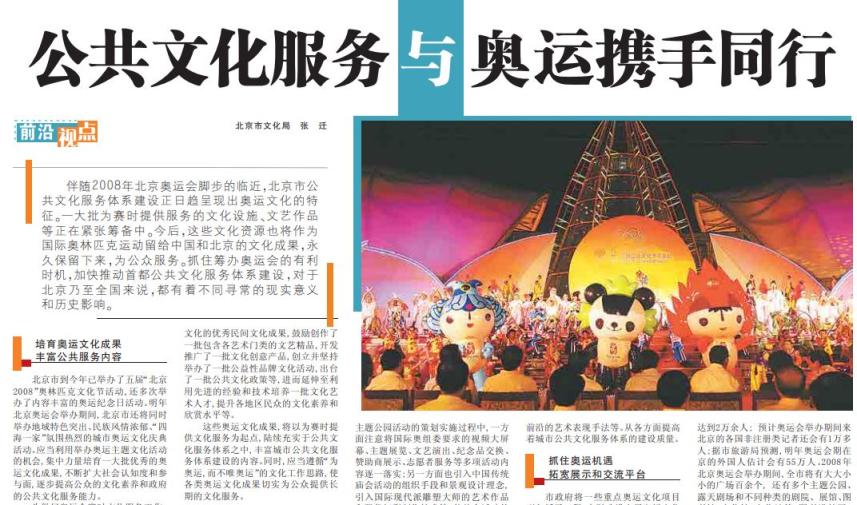 利用举办奥运会的契机,北京整合和建设了一批公共文化场所,利用公园的空间资源新建设了一批露天演出剧场,新建、改造了一批设施先进、更适于市民业余休闲娱乐的文化广场,在露天公共场所安装了一批大屏幕。这些奥运文化成果,很好地丰富了城市公共文化服务。(2007年9月4日《北京日报》8版,《公共文化服务与奥运携手同行》)如群众文化活动比较密集的丰台花园广场,自从广场边上建成了露天剧场后,市民只需花1元钱,走几步路,就可以观看专业院团的演出。(2007年12月4日《北京日报》1版,《筹办奥运带来丰富多彩的文体生活》)