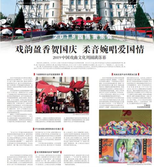 2018年起,北京园博园联袂上演国家级戏曲文化盛典——中国戏曲文化周和园博音乐会。逛园林、听戏曲、赏音乐,在园博园丰富多彩的自然环境中,人们不知不觉就沉浸在优雅戏曲、音乐与园林美景的双重享受中。(2019年10月10日《北京日报》4版,《戏韵盈香贺国庆 柔音婉唱爱国情》)