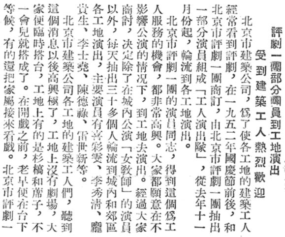 1952年,为了让各工地的建筑工人能看到评剧,北京市评剧一团抽出一部分演员组成“工人演出队”,轮流到各工地演出。建筑工人们听到这个消息后高兴极了。工地没有剧场,大家便用工地上的杉槁和席子搭起临时舞台。在开戏之前,工人们老早便在台下等候,有的还把家属接来看戏。临时舞台虽小,但丝毫不影响喜彩雯、李秀清等三十多位评剧演员演出《刘巧儿》《小女婿》等比较大型的戏。12月天气寒冷,在北郊工地上坚持露天演出的演员们收到了台下工人写的条子:希望你们多穿衣服,别冻坏了身体,甭管好看不好看。演员们很受感动:“观众这么关心我们,比生上火炉还暖哪!”在两个月时间里,评剧一团在北京市建筑公司各工地共演出了39场,观众达到10万多人。(1953年1月5日《北京日报》3版,《评剧一团部分团员到工地演出 受到建筑工人热烈欢迎》)