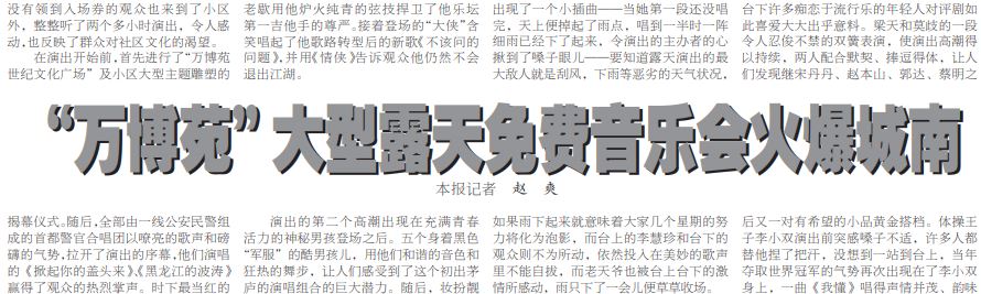 2000年的夏天,宣武区右安门内大街的万博苑小区因一场大型露天免费音乐会成了欢乐的海洋。这场音乐会突破性地把露天文化广场公益演出形式首次引入居民小区,1000张入场券不到两天便一抢而空。许多没领到入场券的观众也不肯离去,就站在小区外整整听了两个多小时。在小区中心花园舞台上,谷文月、陶慧敏、李慧珍、陈琳等众多演艺明星的精彩表演,让数千名观众度过了一个轻松、欢乐的夏夜。(2000年7月12日《北京日报》16版,《“万博苑”大型露天免费音乐会火爆城南》)露天演出,就这样融进了人们的日常文化生活。