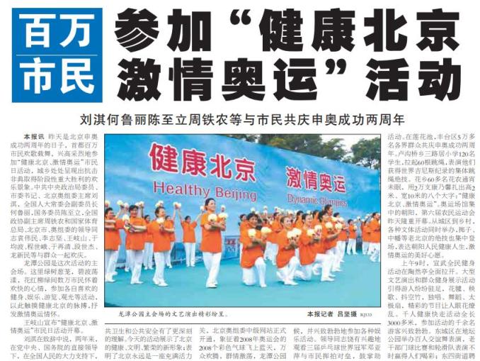 2003年,在北京申奥成功两周年的日子,首都百万市民兴高采烈地参加“健康北京 激情奥运”市民日活动,在各大公园、文化广场观看大型文艺演出。在这次活动的主会场龙潭公园,露天表演丰富多彩,有文艺体育明星的诗歌联唱、京剧联唱,有乒乓球、羽毛球、柔力球表演,以及残疾人运动员表演的轮椅乒乓球等。在大运河畔的文化广场,新秧歌展演现场活力四射。大兴区邀来中央歌剧院交响乐团演出,《天鹅湖》选曲、雷电波尔卡、卡门序曲等世界著名曲目与当地秧歌雅俗共赏,人们的歌声、笑声与热烈的锣鼓声、乐曲声响彻云霄。(2003年7月14日《北京日报》1版,《百万市民参加“健康北京 激情奥运”活动》)