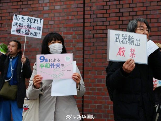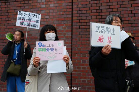 针对日本执政联盟自民党与日本维新会拟取消对武器出口的5种类型限制、为武器出口大幅“松绑”,日本民众25日下午在位于东京的自民党总部前举行抗议集会。